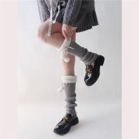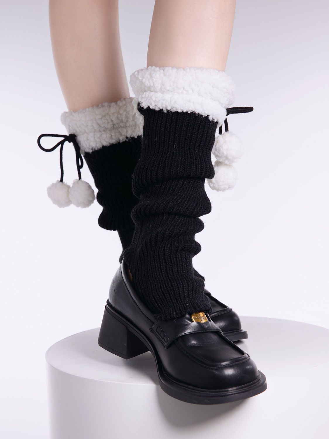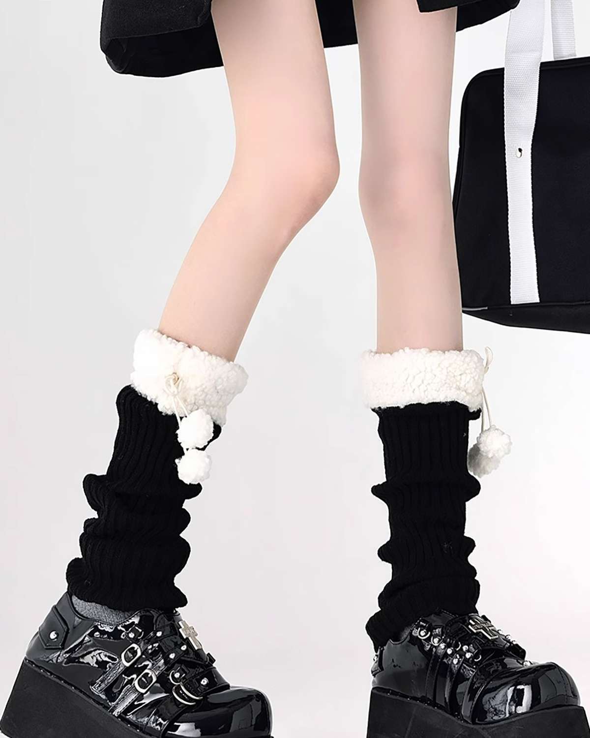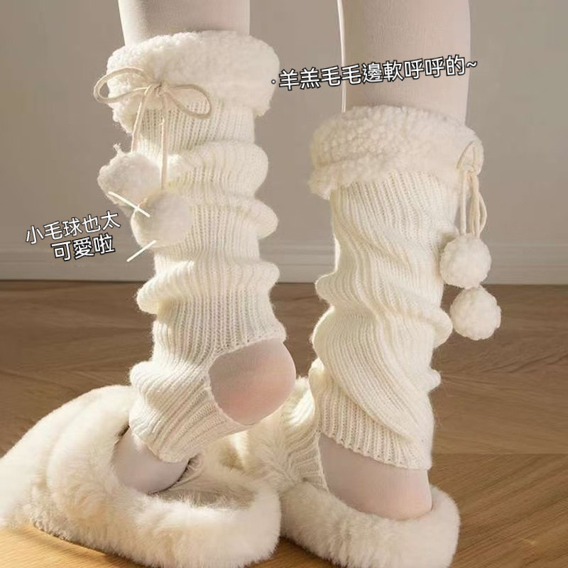 日系洛麗塔蝴蝶結可愛毛球襪套 冬季保暖羊羔絨腿套堆堆襪
